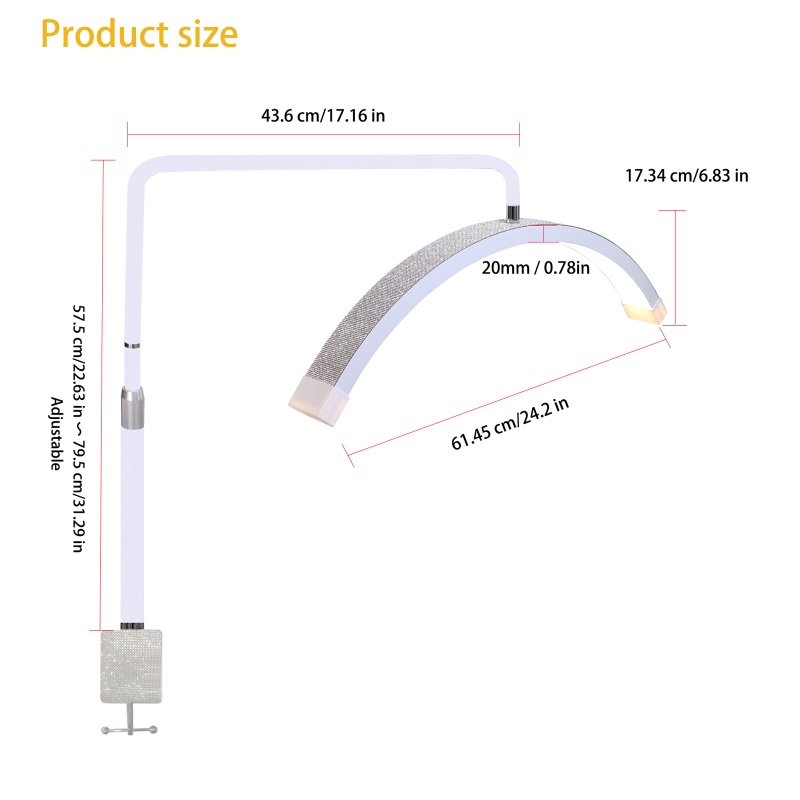Our half moon nail lamp is easy to install and convenient to use. In addition to the stable fixation on the table, without taking up floor space, design tubes that can be flexibly adjusted from 57.5cm to 79.5cm.