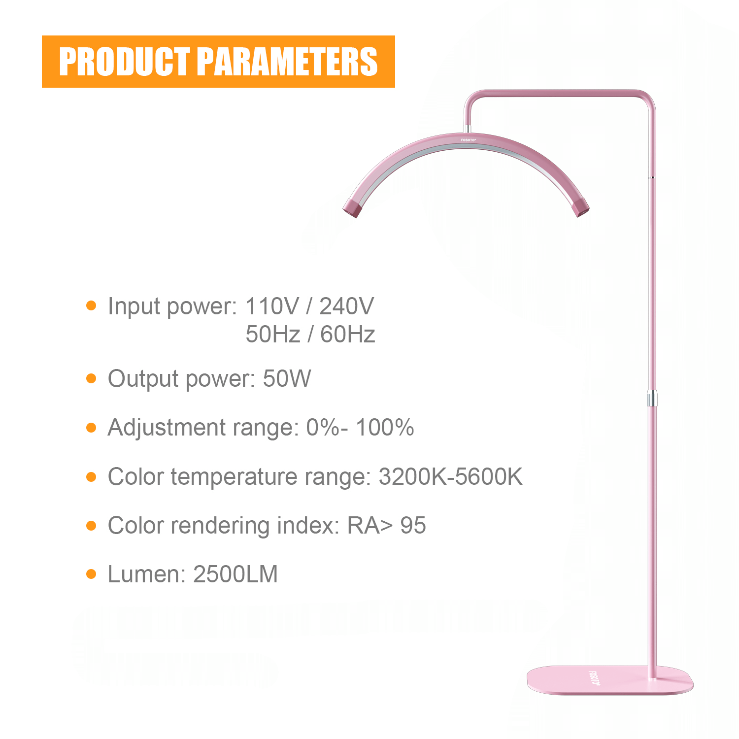【Half-moon Light】fosoto special half-moon shape design with floor stand, It will make your work without any shadow obstruction.with 320pcs high-quality lamp beads, 45W high power and 95+ high color rendering.suitable for lash,eyelash,tattoo,desktop vlog, beauty salon live streaming, beauty project,nail enhancement etc.